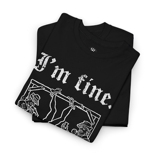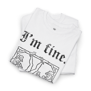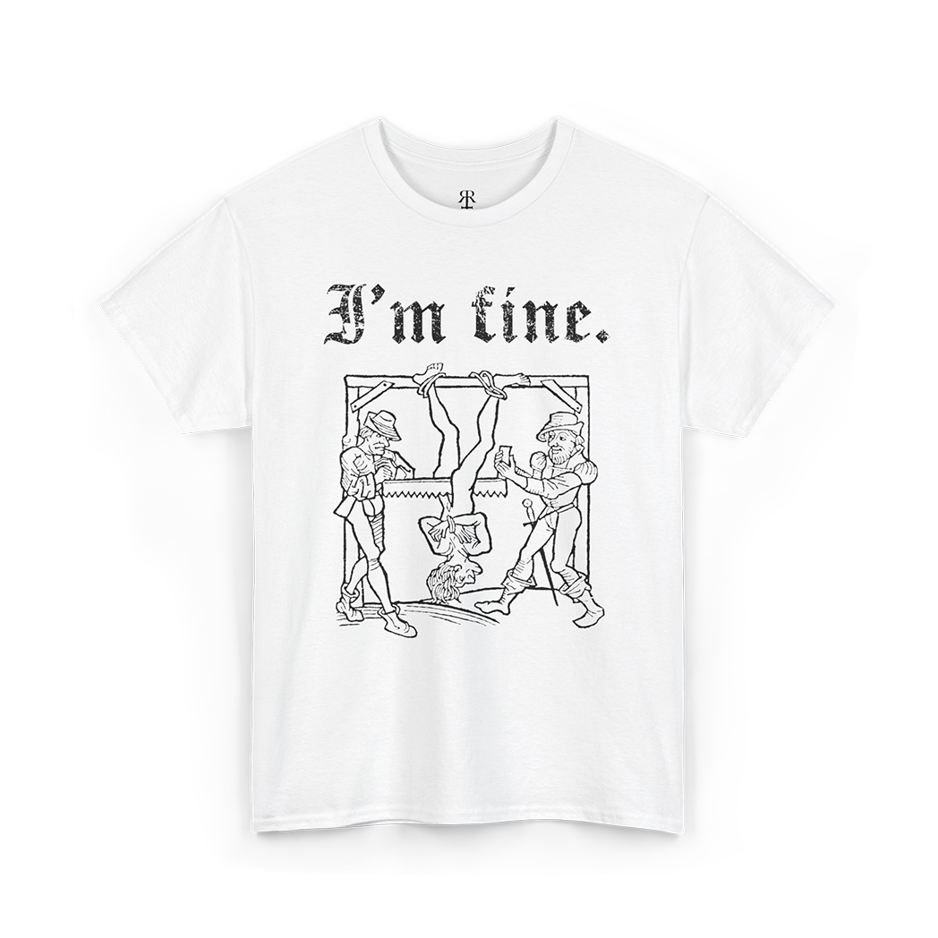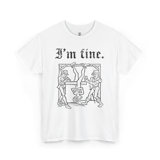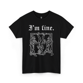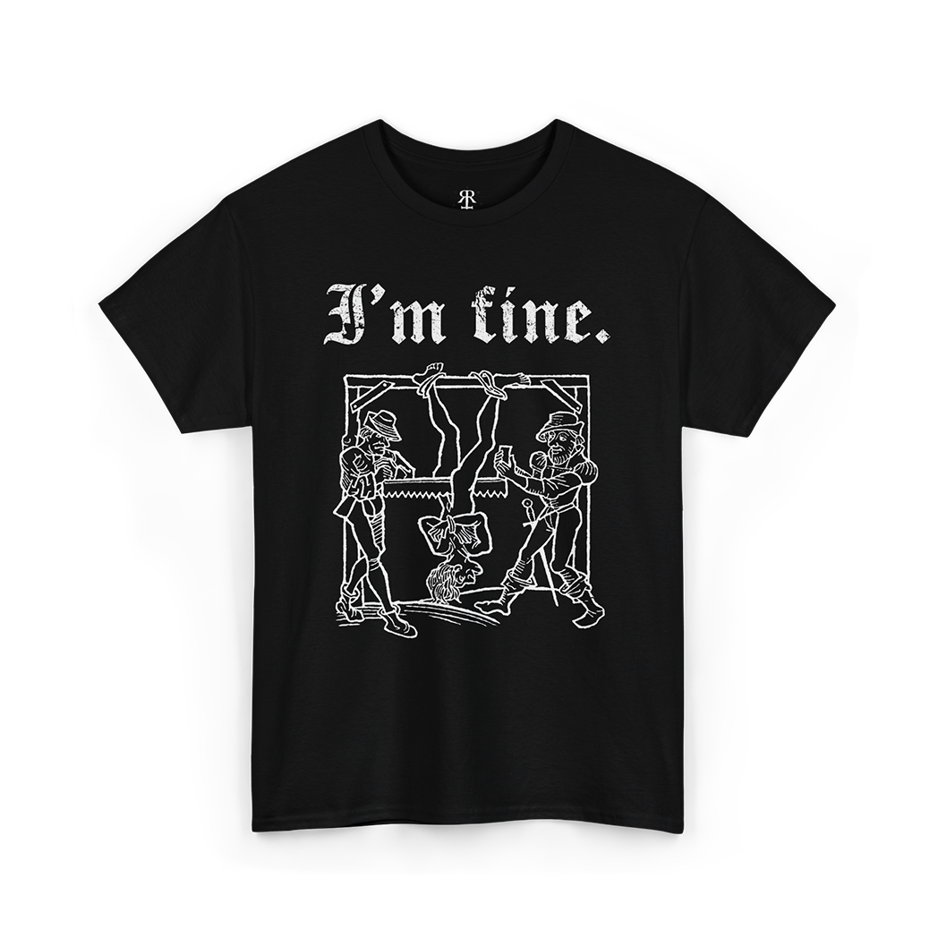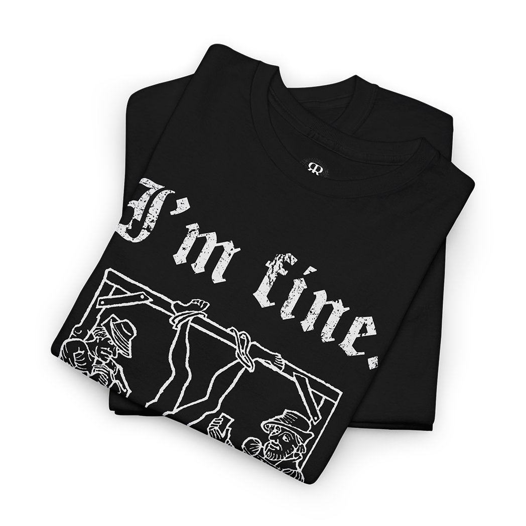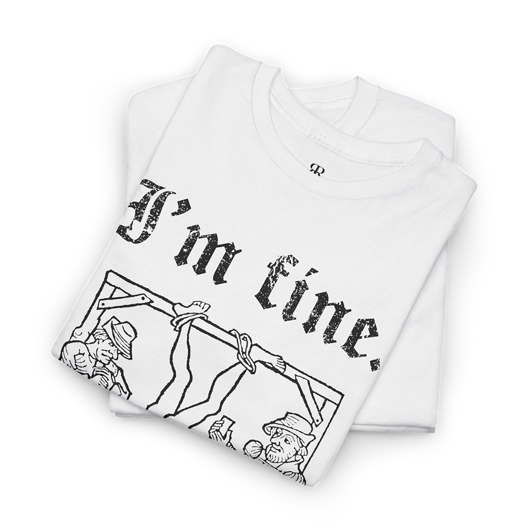Combine dark humor and edgy style with the I’m Fine shirt. Featuring medieval torture illustration with the ironic caption “I’m Fine,” this tee is perfect for those with a taste for macabre humor, alternative fashion, or bold conversation starters.