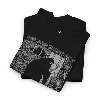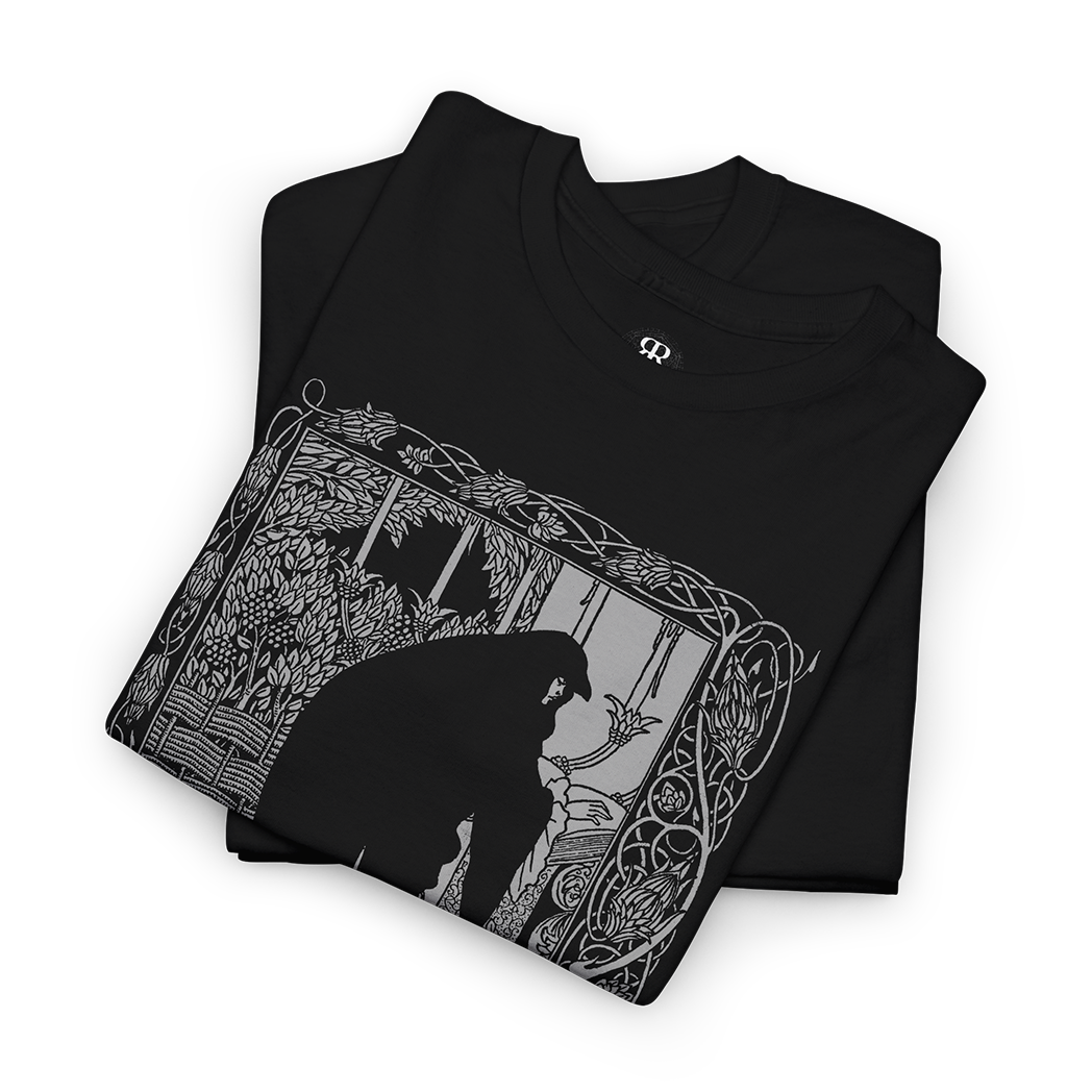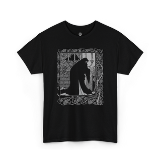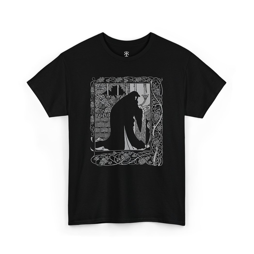 Queen Guinevere Shirt! Queen Guinevere, depicted in Aubrey Beardsley’s Le Morte d’Arthur (1893), is one of the central figures in Arthurian legend. She is the wife of King Arthur and famously known for her love affair with Sir Lancelot, which ultimately leads to the downfall of Camelot. Guinevere represents both virtue and betrayal, embodying the complexity of human nature. Beardsley’s illustration captures her mystique and the tension of her pivotal role in the legendary tale, adding a modern, provocative flair to her medieval narrative.