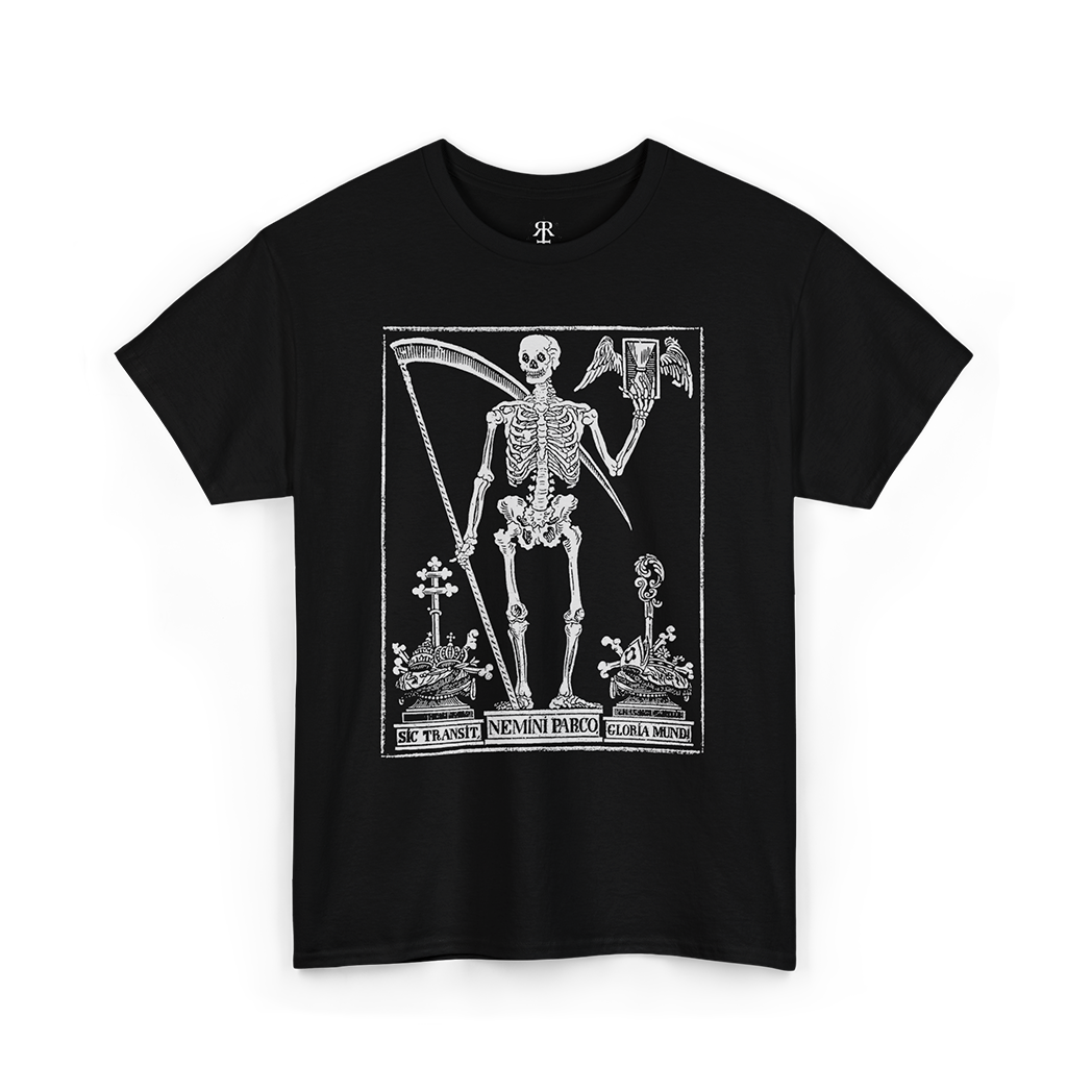 "Sic transit gloria mundi" means "Thus passes the glory of the world," a reminder of life's fleeting nature. "Nemini parco" translates to "I spare no one," a stark declaration of life's impartiality. Both phrases evoke the inevitability of change and mortality.