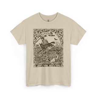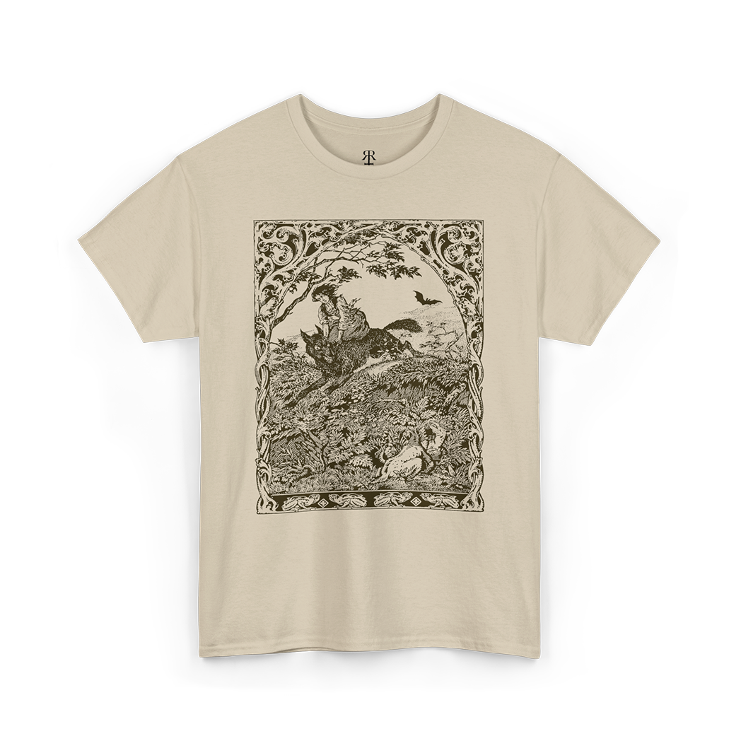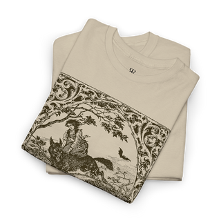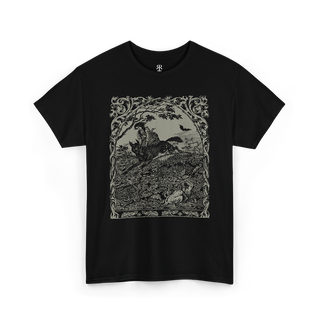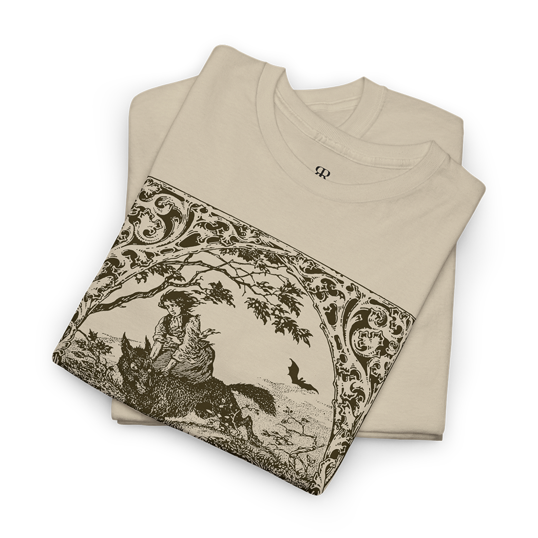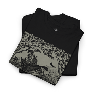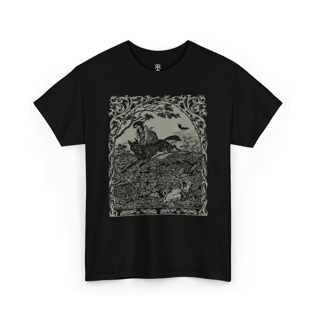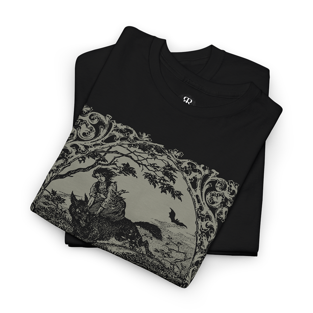 Embark on a mystical journey with our 'Witch Riding Wolf' shirt, featuring the enchanting artwork of Bernard Zuber. Step into the nocturnal world where magic reigns, and a witch, accompanied by her loyal wolf companion, ventures to the sacred gathering of the witches' Sabbath.