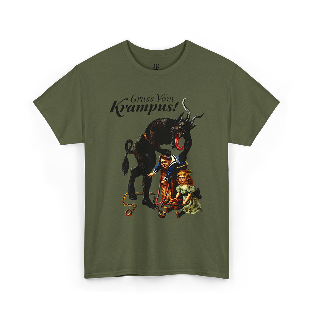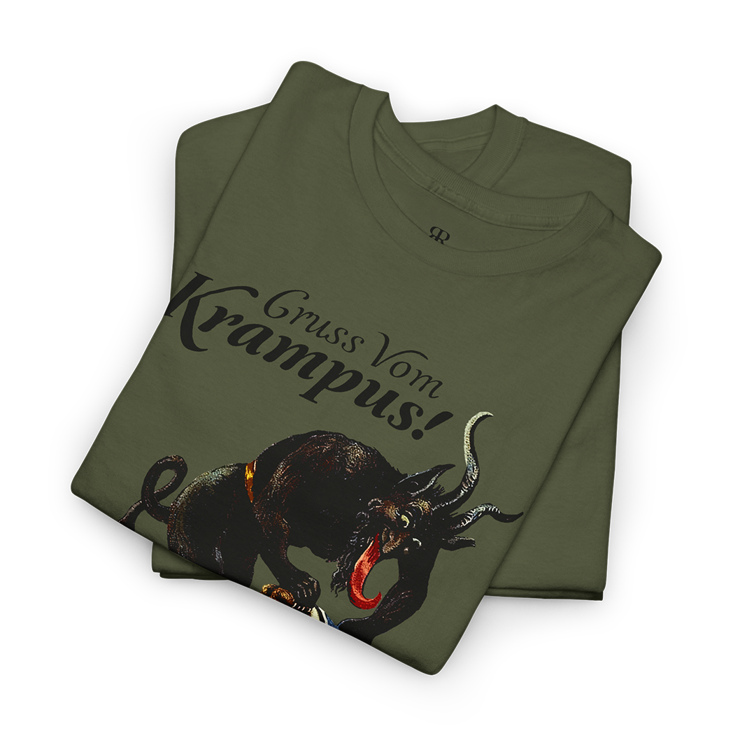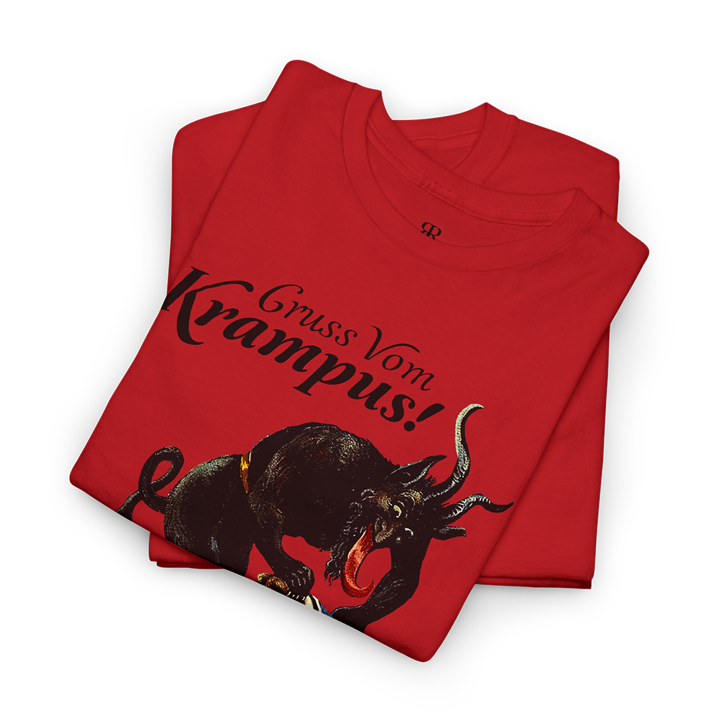 Venture into the shadows with our 'Gruss vom Krampus' shirt, a chilling tribute to the enigmatic figure that dances on the edge of folklore and fear.