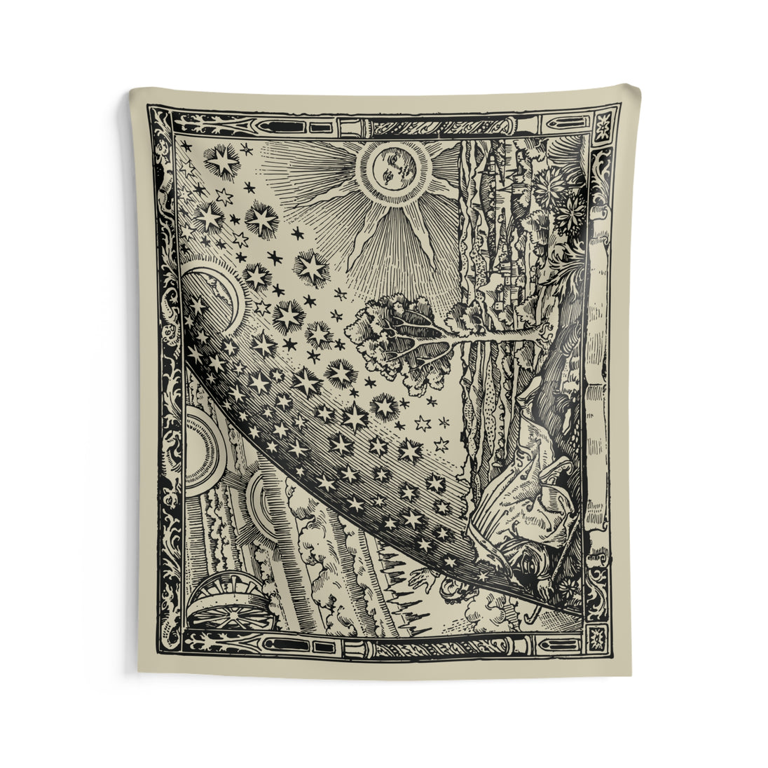 The Flammarion engraving is a wood engraving by an unknown artist. It is an iconic representation of the quest for knowledge, and depicts a traveler peering through the veil of the cosmos, reaching for the stars. It has been used as a metaphorical illustration of either the scientific or the mystical quests for knowledge and, more recently, of the psychedelic experience. Crafted with the highest quality materials, our tapestry is not just a piece of art; it's an invitation to embrace the mystique and allure of the Flammarion. Elevate your surroundings and infuse your home with the magic and mystery depicted in this timeless creation.