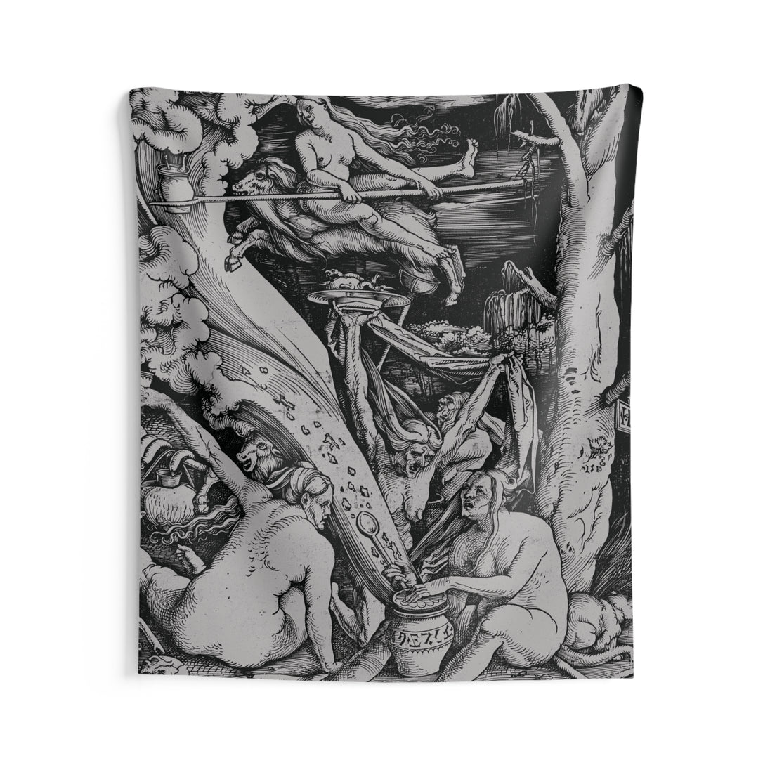 Original woodcut by Hans Baldung, 1510. Tapestry depicts witches preparing to travel to the Sabbath by using flying ointment. This is one of the first Renaissance images to depict both witches that fly and a Witches' Sabbath. Surrounded by human bones and animal familiars, a group of witches engage in naked revelry as they soar through the air and prepare food for the Sabbath. Crafted with the highest quality materials, our tapestry is not just a piece of art; it's an invitation to embrace the mystique and allure of the Witches Sabbath. Elevate your surroundings and infuse your home with the magic and mystery depicted in Baldung's timeless creation.